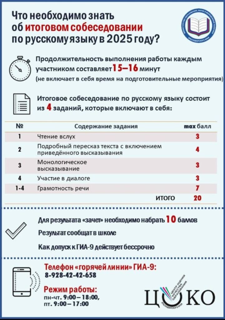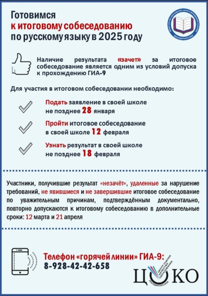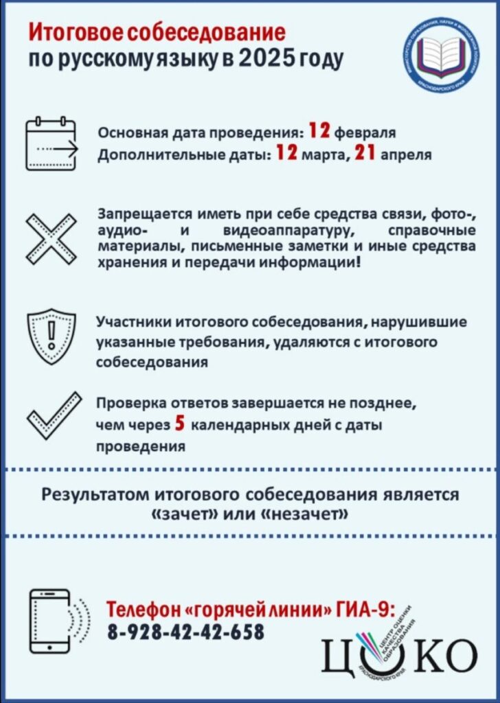 Информация о датах, порядке проведения, проверки и информирования о результатах итогового собеседования по русскому языку в 2025 году
