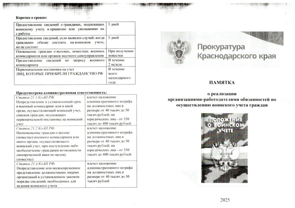 Памятка Прокуратуры Краснодарского края «О реализации организациями-работодателями обязанностей по осуществлению воинского учета граждан»